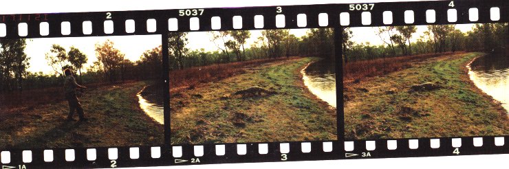 One afternoon, we interrupted our hunting with some fishing and caught Saratoga, Black Bream and catfish. A local Freshwater croc took a fancy to the catfish splashing at the water’s edge. Then freshly headed straight over, left the water and grabbed it. I videoed the whole thing in amazement! The seven-foot long croc fought with Ken and his fishing rod, as the catfish was still on the line. It wasn't till the line snapped and the swivel exploded into Ken's chest like a whip crack that the tug of war ended. The croc scattered off to enjoy this meal, while Alisdair and I crashed to the ground laughing. After that, Barramundi were hooked, but regrettably none of them landed. We hunted a swampy watercourse surrounded by overhanging trees where you’d almost expect pigs to be, but after an hour we emerged with not a sign or sighting of a pig.