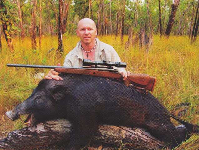 Another eight hundred metres on, we disturbed a mob of fifteen sows that we watched for a while before they slowly trotted off into the bush. Suddenly, a huge black boar launched out of the creek bed just in front of me. I was better prepared this time, but the boar didn’t slow as he rushed into long green grass. I immediately sighted him on the clearing just ahead. Once he exited his cover, the Remington 150gn entered just above the left front leg and exited through the boar’s head, causing a dramatic tumble.