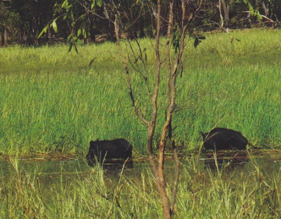On one occasion, we started a stalk onto a dam through paperbark trees, when pigs were sighted in the swamp beyond the dam. As soon as they left, I set up my rifle against a tree and watched the original mob of pigs wallowing and playing at the water’s edge.