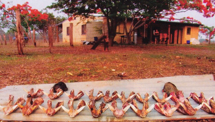 On the third morning, we walked creek after creek with no result, but on the fourth walk, we secured four of the best pigs we’d ever come across. With Ken on one side and me the other, we soon found what we were looking for - a big boar camped-up in the riverbank avoiding the heat of the day. It sprang up only ten metres away. The boar slowed to get an impression of what had disturbed his slumber, but the bullet was already on its path smashing into his upper chest and killing him instantly. The tusks I quickly found were my best set ever.